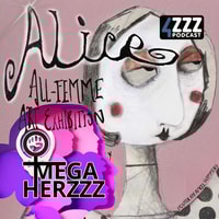 📸 ID: The poster for the Alice exhibition In the foreground is the Megaherzzz and 4zzz Podcast logo in the bottom left and top right respectively.